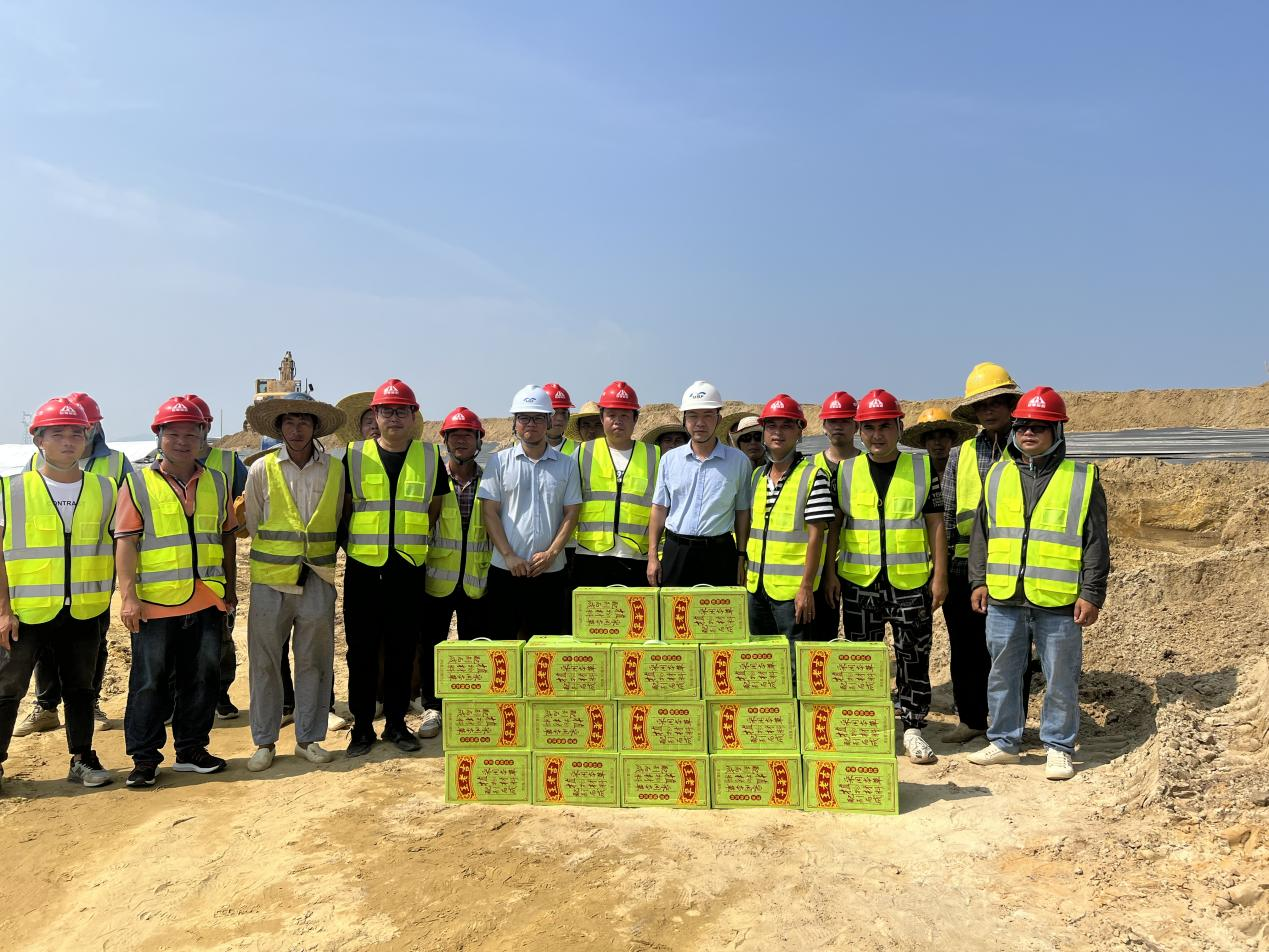 在場平二期工程項目現場,一線工人正全心全力投入工作中,集團領導、城投公司總經理劉洪與工人們握手問候,送上清涼禮包,了解當前工程進展情況,叮囑工人注意安全,施工單位落實相關保障措施。