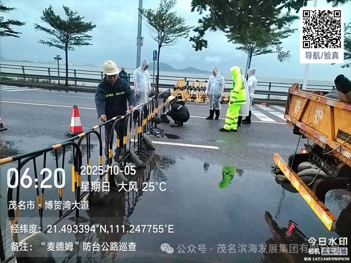 臺風影響尚未全面顯現,防御工作已率先展開。10月5日凌晨5時33分,養護中心搶險隊已按濱海新區要求冒雨集結為封閉博賀灣大橋做準備。歷經1小時17分鐘的緊張作業,當日6時50分順利完成博賀灣大橋封閉任務,有效規避了臺風期間橋面通行風險,為后續搶險救災工作爭取了關鍵時間窗口。