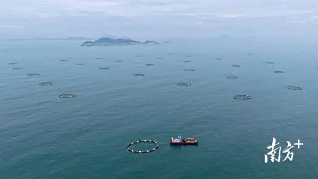 從茂名吉達(dá)港區(qū)東華能源重件碼頭起航,搭乘養(yǎng)殖運(yùn)輸船,約1個(gè)小時(shí)就能抵達(dá)茂名大竹洲海洋牧場養(yǎng)殖區(qū)。從高空俯瞰,數(shù)十個(gè)深水網(wǎng)箱排列在海面,蔚為壯觀。